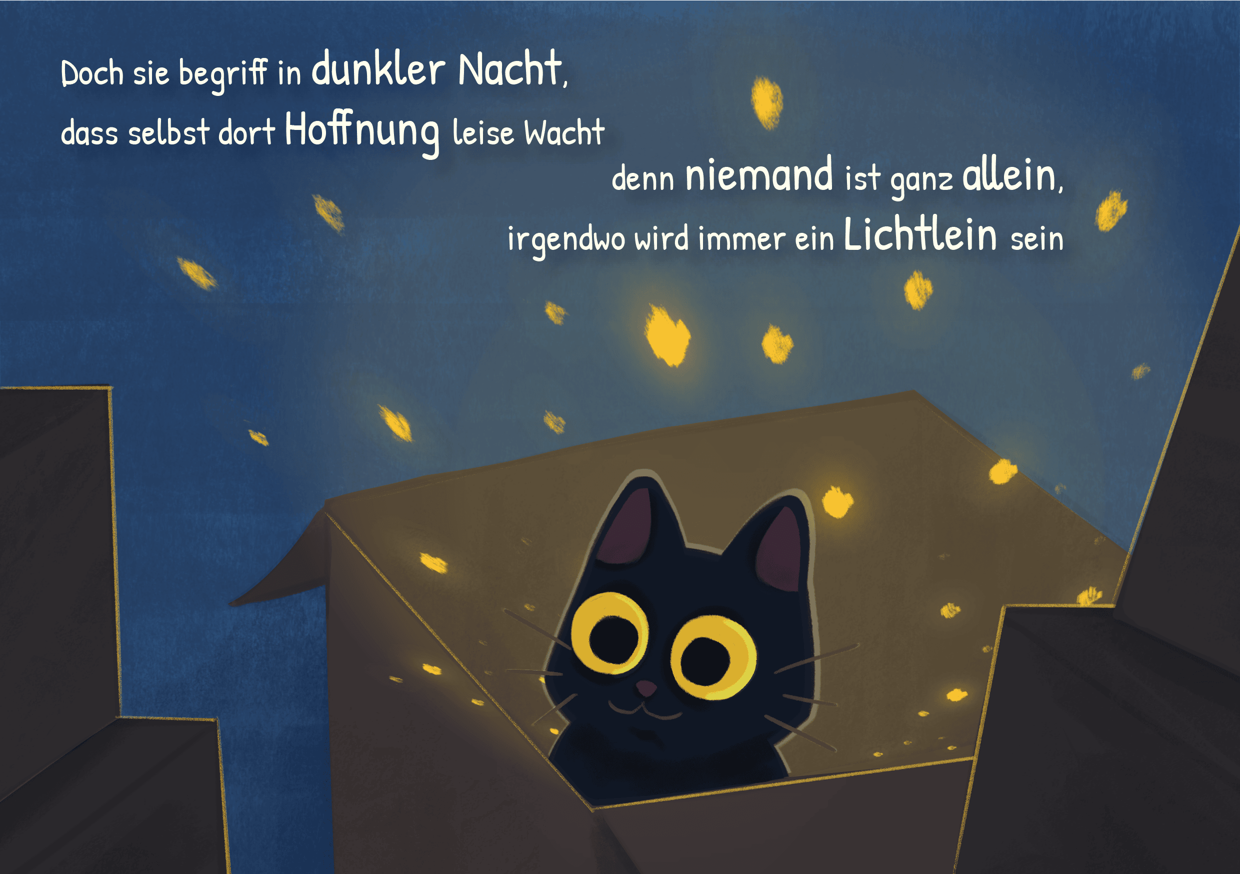 In dieser Geschichte begleiten wir ein kleines Mädchen auf ihrer Reise in die Welt der Emotionen. Dabei beginnt ihre Reise bei sich zuhause, kurz vor einem Umzug. Durch einen Zufall bemerkte sie einen leuchtenden Karton mitsamt einer Katze. Gespannt versucht sie die Katze zu erreichen und fällt dabei in die Welt der Emotionen. Dort sucht sie nun nach der Katze und lernt dabei, wie sie mit ihren Emotionen umgehen kann.